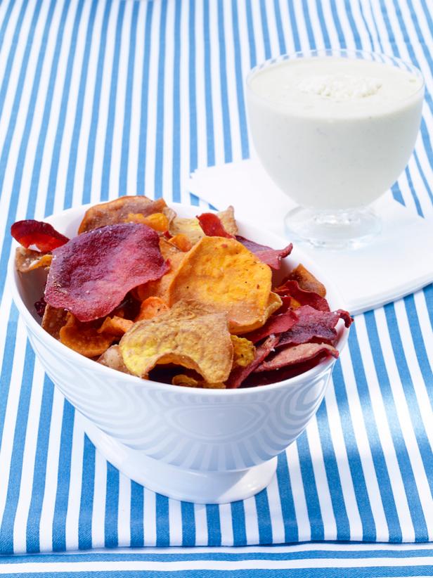 Make the chips: Heat 1 to 2 inches vegetable oil in a large pot over medium heat until a deep-fry thermometer registers 350 degrees F. Rest a cooling rack on a baking sheet lined with paper towels. Spread some flour in a baking dish, add the beet slices and toss. Tap off the excess flour, then fry the beets in batches (don't overcrowd the pot), stirring occasionally to make sure they don't stick to each other, 3 to 5 minutes, or until the fizzling around the chips slows down.