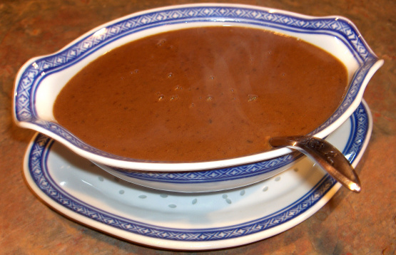 Pour fat off, leaving brown bits and juice and bits of stuffing or meat stuck to pan, but remove any skin stuck.