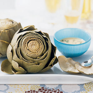 Yield: 4 servings (serving size: 1 artichoke and 3 tablespoons dip)Prep Time: