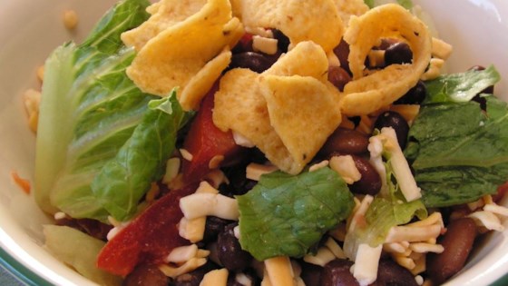 In a large bowl, combine the romaine, cheese, pinto beans, black beans, and tomatoes.