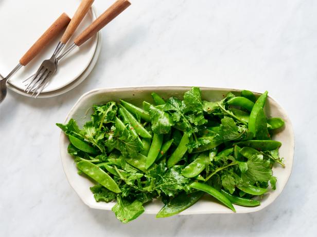 When ready to serve, transfer the snap peas to a large bowl and season with salt, the red pepper flakes and a pinch of sugar. Toss to blend. Add the raw snow peas and arugula and drizzle with the dressing; toss to coat. Serve immediately.