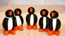 4 Place the small carrot slice (from step 1) into the hole of a small pitted black olive. Slide the small black olive onto the toothpick to finish your penguin!