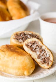 To make the dough, in a large mixing bowl, combine flour, yeast and salt. Add vegetable oil and water and mix until smooth. (If dough is too dry, add more water a little bit at a time until dough smooth and soft. Also, if the dough is too wet, add a little bit more flour.) Coat the dough with a little bit of vegetable oil and place it back in the bowl. Cover with damp kitchen towel and place it in a warm place to rise, for about 30-60 minutes. (I put it in a microwave with a glass of hot water. Don’t turn on the microwave.) Meanwhile, prepare the filling. Heat olive oil in a large skillet or dutch oven over medium high heat. Add the meat, garlic and salt. Cook the meat, breaking it apart with a wooden spoon, until cooked through. Transfer into a large bowl and mix it with rice. Once the dough is doubled in size, take it out onto a lightly floured surface and knead into a smooth ball, 1-2 minutes. Lightly flatten the dough ball into a disk, and divide into 12 equal parts as you slice a pizza. Roll each piece into a smooth ball. To make the hand pies, take a piece of dough and flatten it with your hands. Put the filling in the center and fold the dough in half. Pinch the edges of the dough to seal, creating a half moon. Then gently flatten it between your palms, making sure the sealed crimps are on flat side. (If it’s not clear, check out the photos above.) Once all the hand pies are formed, heat 1-inch oil in a large skillet, or dutch oven. (Tip: You don’t need a thermometer to fry these savory hand pies. Simply drop the end of a wooden spoon into heated oil, and if it’s bubbling up around the wood, that means the oil is ready for frying!) To cook the hand pies, drop 4 hand pies in the hot oil and cook until golden brown, 3-4 minutes. Flip and cook until it’s nice and golden. Remove into a bowl, lined with paper towel to absorb excess oil. Continue with the remaining batch. Serve piroshki warm or at room temperature.