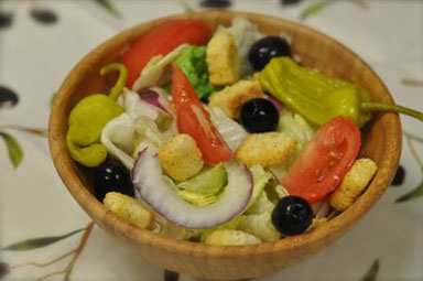 1. In a large glass or wooden salad serving bowl, toss together the lettuce mix, onion slices, olives, pepperoncini, tomatoes, and croutons. Add dressing and toss to combine.