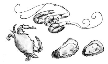 Sauce onions, celery, and green pepper in bacon fat until onions are translucent. Add spices. Add water, tomatoes, and tomato sauce. Bring to a boil, add roux, and cook until mixture thickens. Add shrimp, oysters, crabmeat, and okra and simmer until cooked. Add salt and pepper.