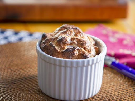 Don't level the souffle batter by swiping a spatula across. One side will often get stuck that way, and you'll get a lopsided souffle. Instead, lightly tap the souffle batter to level it. You might lose a few bubbles in the batter, but it'll rise.