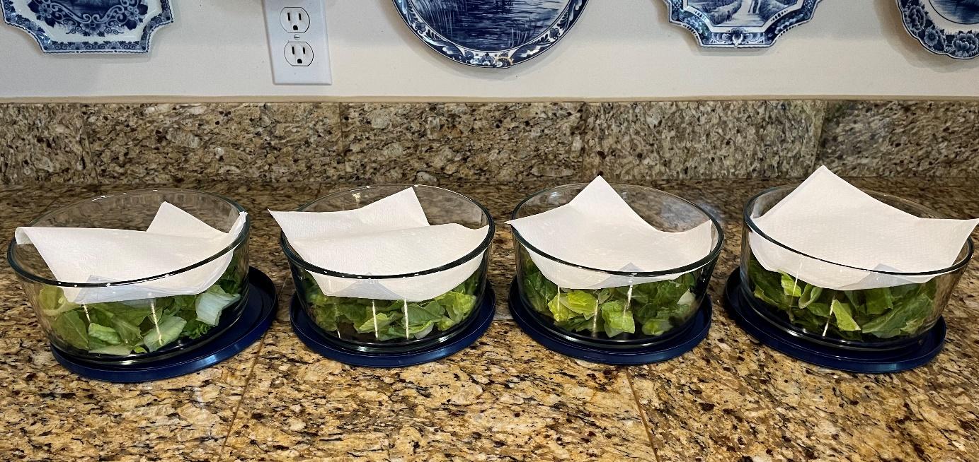 From here I divide the lettuce into airtight salad bowls, place a piece of paper towel atop the lettuce as extra insurance against any formation of future slime.