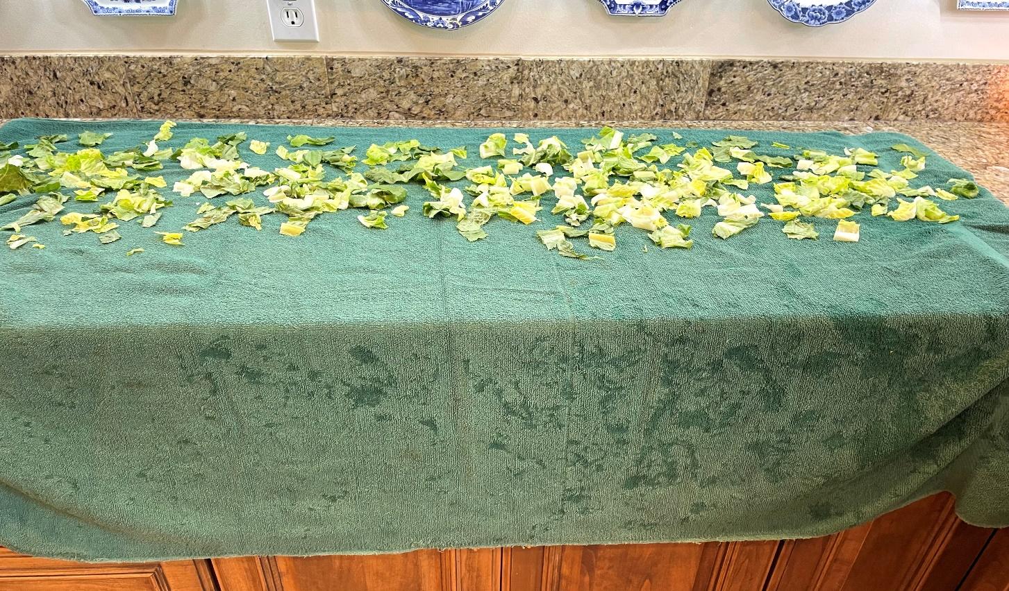 As soon as I get home from the grocery store, I remove the twist-tie band from the lettuce. I fill my clean sink with ice cold water; then I cut the bottom off my lettuce, separate the leaves, and cut them into salad-sized pieces. Then I plunge the entire head of cut lettuce into the ice water. I let it sit for a few minutes. Meanwhile, I lay out an old bath sheet atop my counter (that I’ve saved for this purpose).
