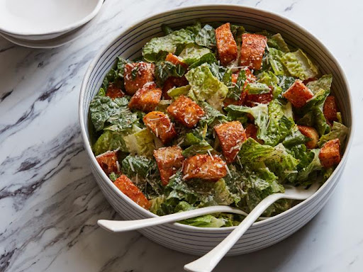 For the Caesar salad croutons: Cut the baguette into cubes. Melt the butter in a skillet and add the garlic powder, paprika and pepper. Add the bread cubes and saute just until the bread cubes begin to brown. Set aside to cool.