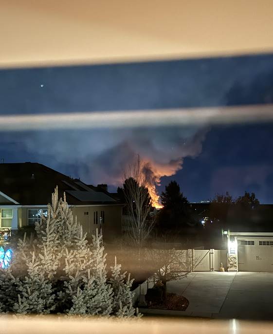 The fire broke out about 4:00 am, and this is a shot from the front yard of one of our neighbors. It raged for several hours, died down, then started up again.