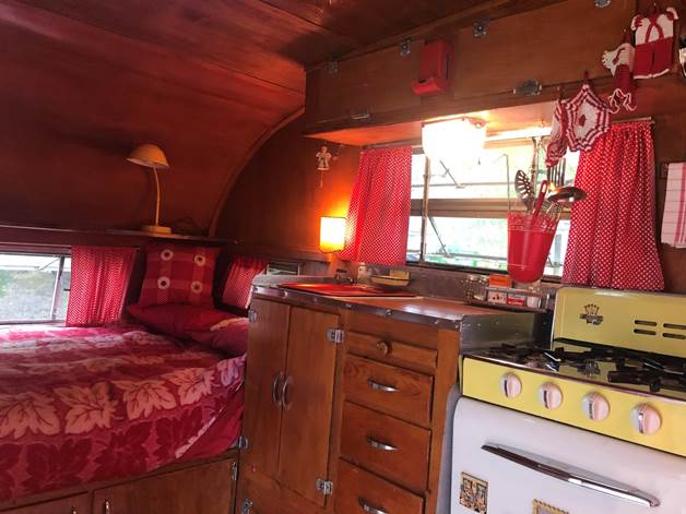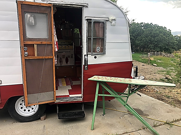 The wooden ironing board was our “buffet table” that we’d place alongside the campsite picnic table. The adorable yellow-enameled stove and oven cooked up absolutely delicious meals. We had so much fun dining in this darling home-away-from-home.