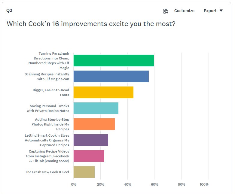 The clear #1 favorite was the new Elf Magic feature that turns recipe directions into clean, numbered steps. I shared this feature in a recent newsletter article and demonstrated it during the Cook’n 16 Live Release Event, and it was exciting to see just how strongly it resonated with you.