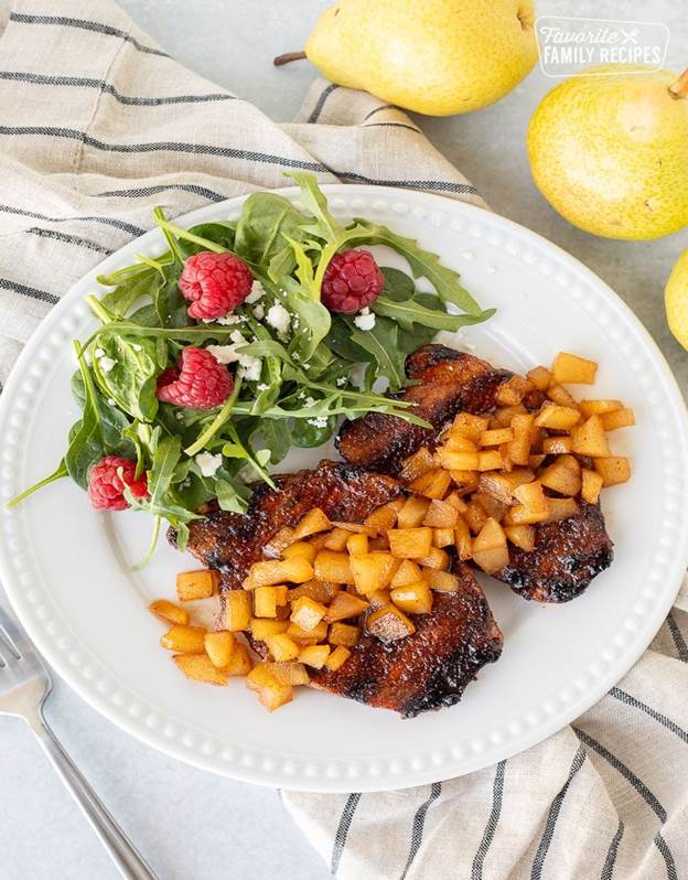 For instance, Melissa, an amateur gourmet cook neighbor, just had us over for a BBQ that featured thin grilled pork chops topped with a diced pear glaze. Holy cow they were good.