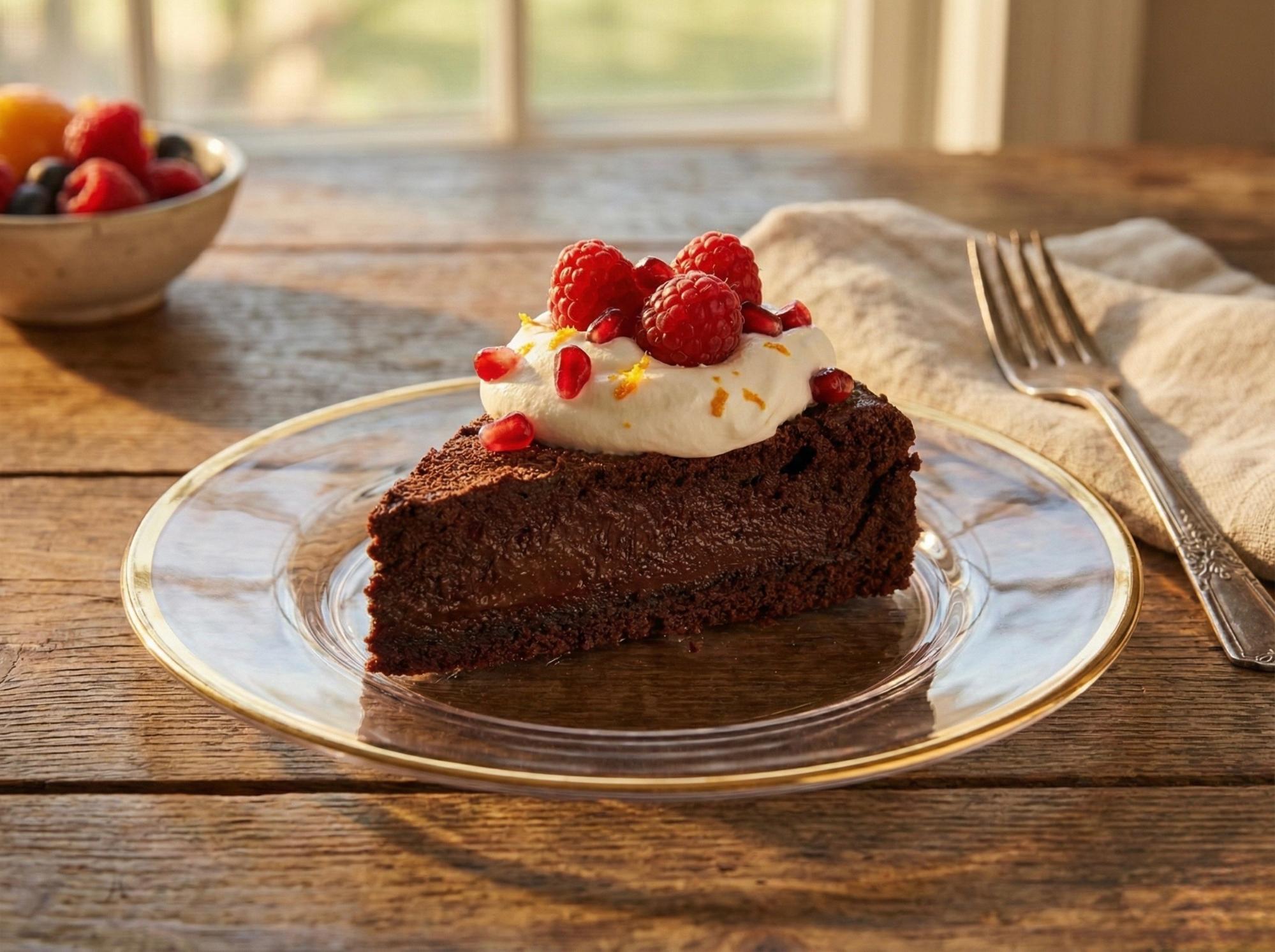 It’s closer to a flourless chocolate torte in style — think of desserts like Torta Caprese, where richness and density are the point. We bake this gently in a water bath so the eggs set like custard instead of cake.