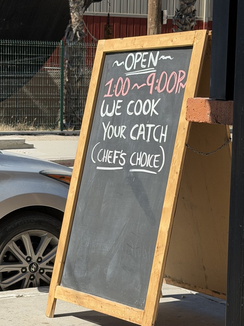 ...with a sign that read, “We cook your catch.” Perfect.